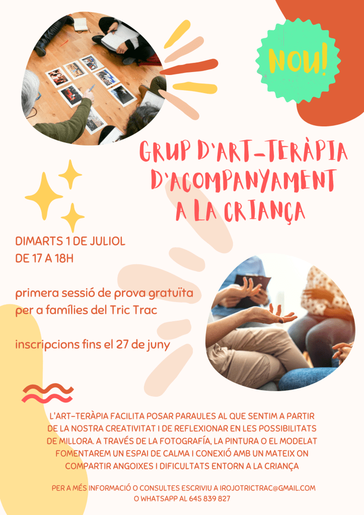 L’art-teràpia facilita posar paraules al que sentim a partir de la nostra creativitat i de reflexionar en les possibilitats de millora. a través de la fotografía, la pintura o el modelat fomentarem un espai de calma i conexió amb un mateix on compartir angoixes i dificultats entorn a la criança.
